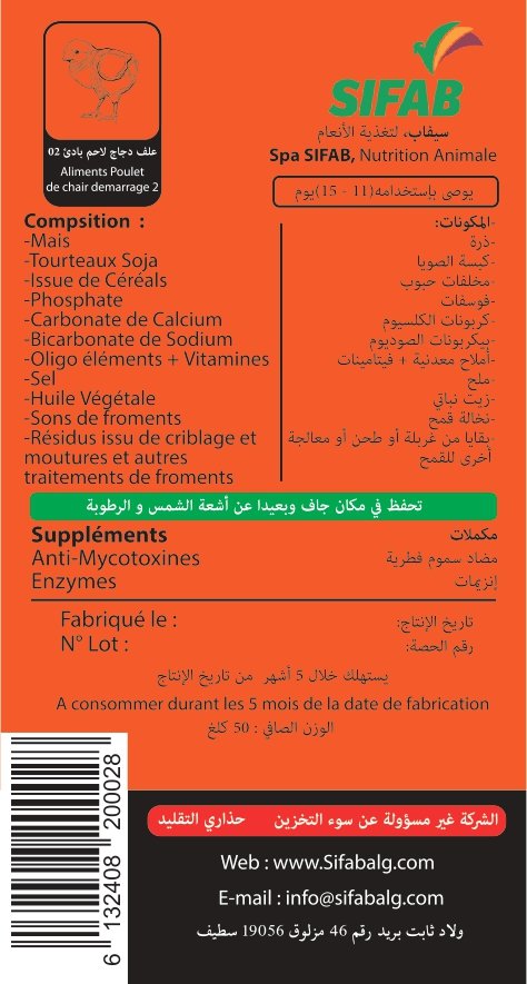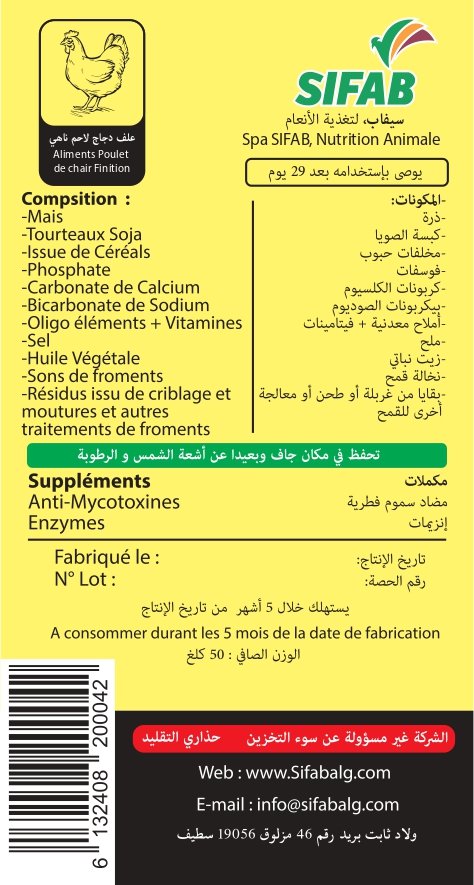 (FR): Aliment bien équilibré des nutriments et des minéraux qui assure les besoin nutritifs des poussins âgé de 28 jours à l’abattage, (avec une quantité de 3000 g /poussin).